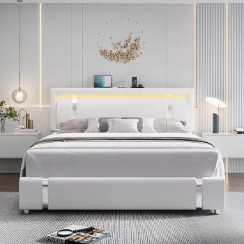 LED Smart Platform Bed with Upholstered Headboard and Storage Drawers