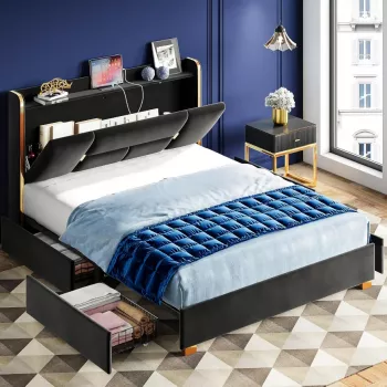 Upholstered Bed Frame with Charging Station and Storage Drawers