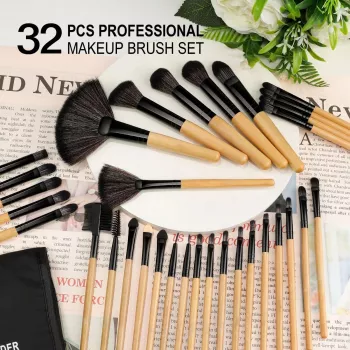 32-Piece Natural Hair Makeup Brush Set with Premium Wooden Handles