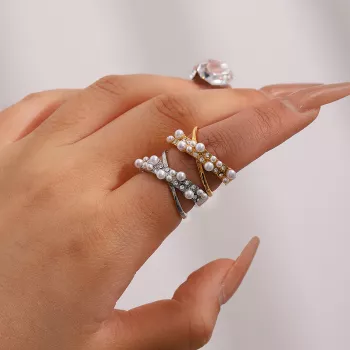 18K Gold Color Stainless Steel Pearl X-Shaped Interlocking Stackable Ring